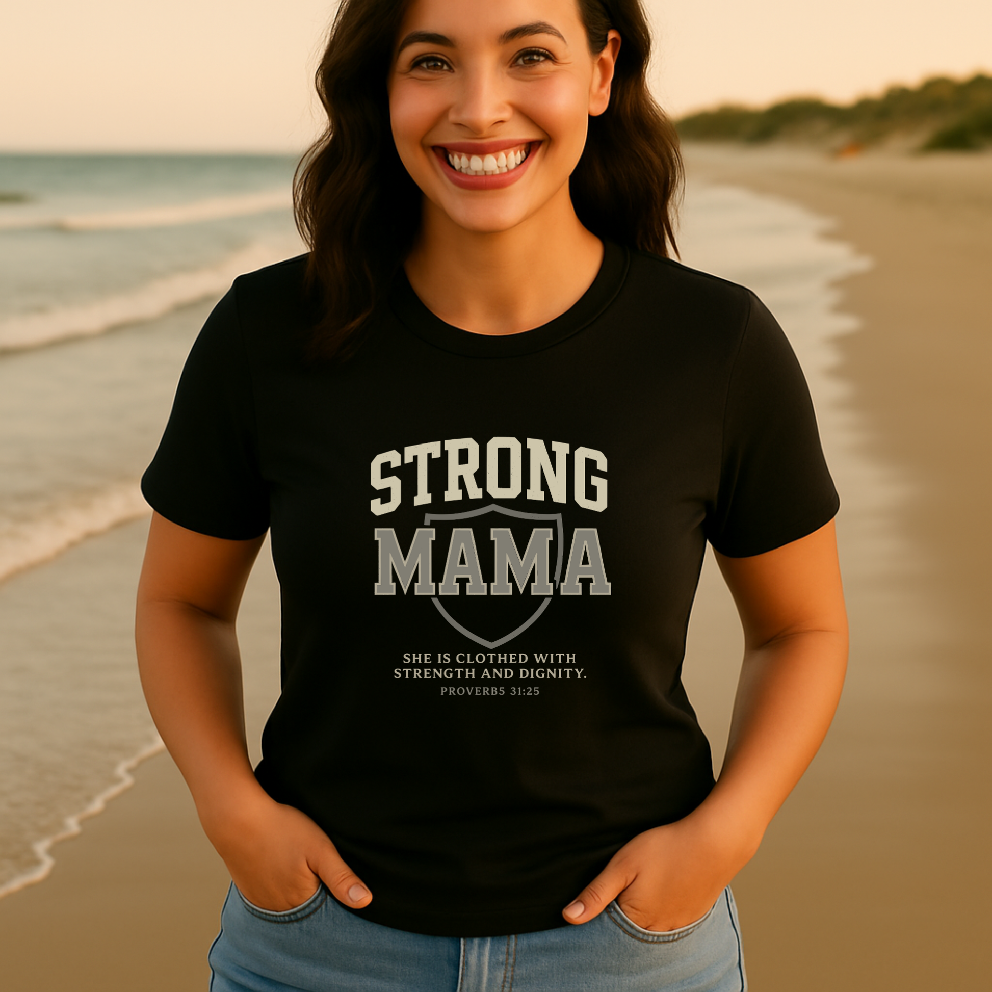 This tee is made for the women who carry strength and dignity in everything they do. With bold varsity-style lettering and a shield design, the “Strong Mama” paired with Proverbs 31:25 shirt is both empowering and timeless. Whether it’s a Mother’s Day surprise, a birthday gift, or simply a way to honor her, this piece blends casual comfort with a message she’ll wear proudly.